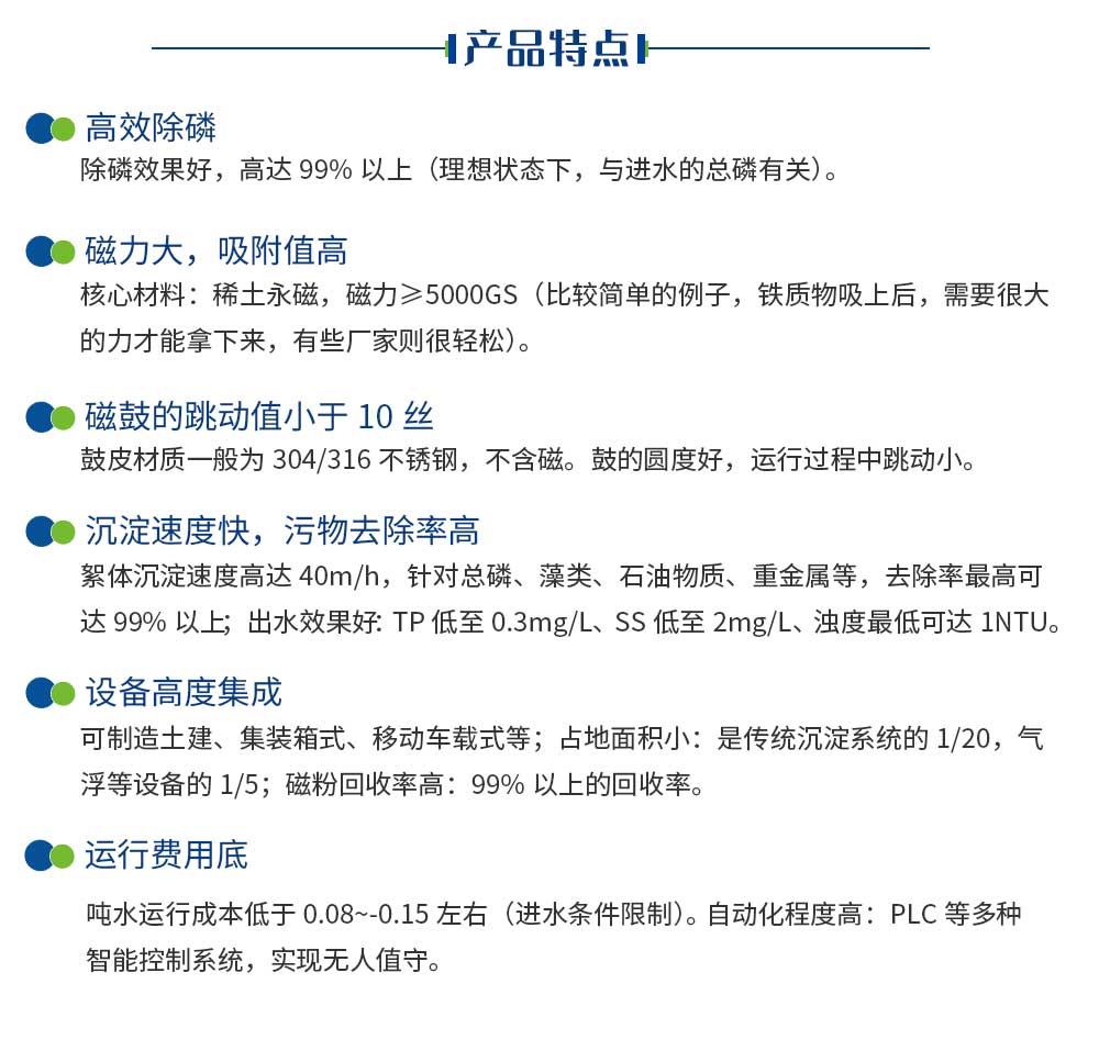 :HC-Mag是我公司研發(fā)制造的一款新型水處理裝備,其原理是在傳統(tǒng)的絮凝沉淀工藝中加入磁性微粒(即磁粉),經(jīng)過絮凝、吸引、附著、電荷吸附、架橋、網(wǎng)捕等步驟,將水體中的藻類、微小懸浮物、膠體、細菌等不溶性污染物與磁粉有效結(jié)合,最終形成高密度絮凝體,依靠重力作用和斜管(板)沉淀原理,實現(xiàn)固液的快速沉淀分離。